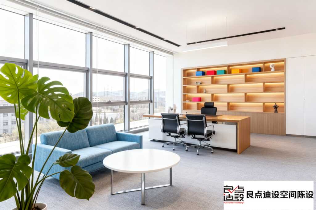 封面圖: 陽光通透的開放式辦公區(qū),淺灰布藝沙發(fā)+原木書架+綠植墻,搭配暖光落地燈,角落擺著藝術咖啡杯。視角俯拍,突出空間感與氛圍感 (輕盈不占地兒,小空間秒變通透!
