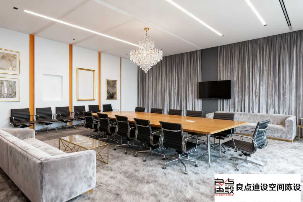 質(zhì)感會(huì)議空間: 長條巖板會(huì)議桌+皮質(zhì)會(huì)議椅(帶金屬腳)+特色吊燈。墻面掛大幅抽象畫或質(zhì)感木飾面,開會(huì)都變高級。