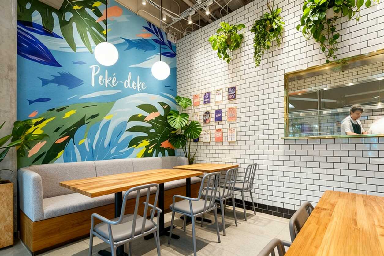 再看看細(xì)節(jié)控狂喜的文案彩蛋:墻上重復(fù)出現(xiàn)的“KEEP CLAM(P)”“Poke Bowl”“SHAKA”,明明就是給菜品埋梗——明擺著告訴你這是家玩轉(zhuǎn)夏威夷波奇碗的專門店嘛!連“AI生成”“為人類服務(wù)”這種調(diào)皮slogan都敢塞進(jìn)裝飾里,老板的腦洞我服了。