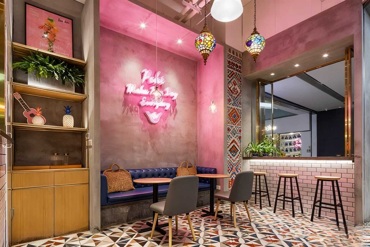 家人們,你們有沒有遇到過那種一走進(jìn)去就忍不住掏手機(jī)的餐廳?今天咱就來扒一扒這家憑軟裝直接封神的網(wǎng)紅店!說真的,光是那面墻就夠你拍九宮格了——紅橙黃綠藍(lán)的彩旗串成一排,上面印著“SALMON”“ALOHA”這種自帶度假感的英文詞,再配上熱帶植物圖案,瞬間把你拉進(jìn)夏威夷海灘模式。背景是干凈到反光的白色瓷磚墻,深藍(lán)色皮質(zhì)卡座往那兒一擺,高級(jí)感直接拉滿,懂的都懂這是出片神器啊!