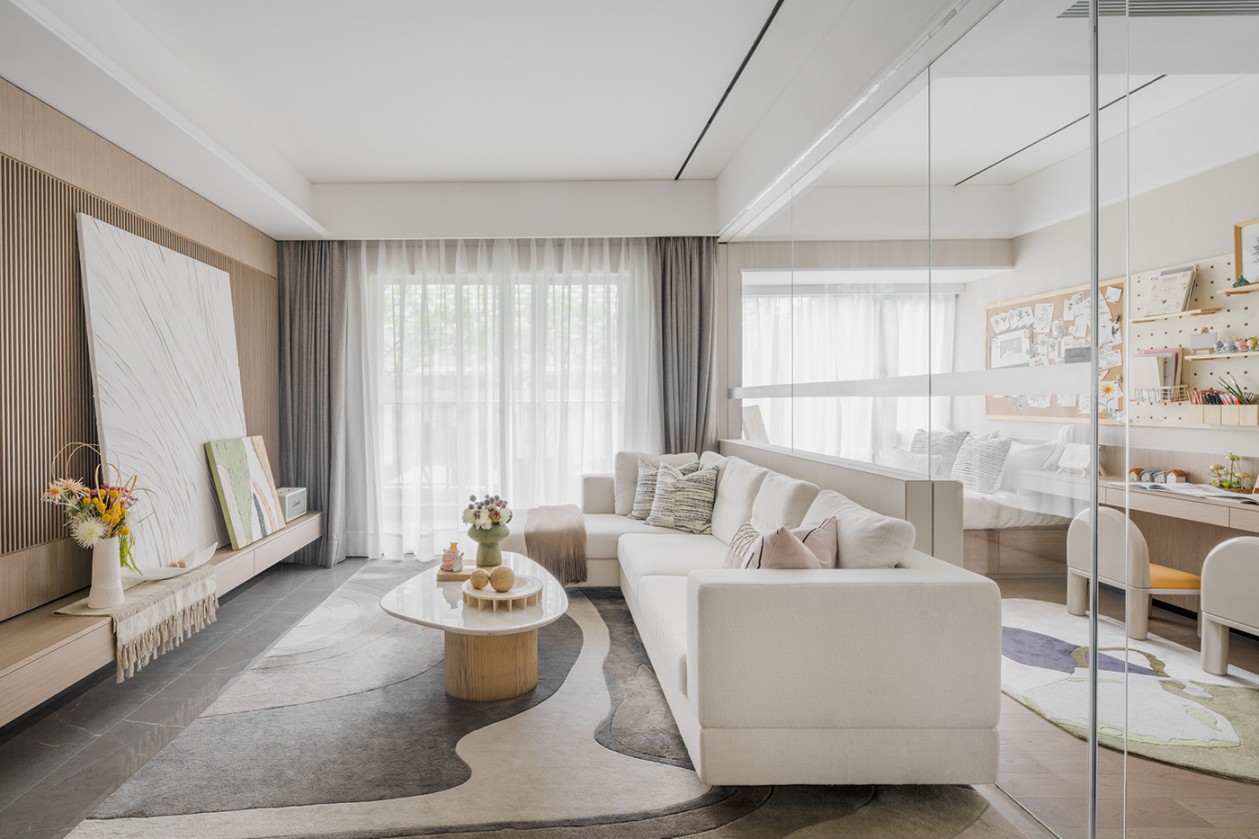 在軟裝設計中,空間色調(diào)和家具搭配有關系,還和地板的顏色、打光等有關聯(lián)。為了讓窗簾增加通透性,窗簾的顏色可以選擇與空間色調(diào)同一個“頻道”的顏色,這樣不太容易搭配出錯,不會突兀地打破空間整體感。