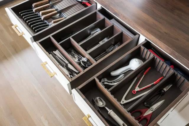地柜收納的廚房物品種類多,因此越常用的物件就擺放在地柜***常見的位置,例如中間的地柜就擺放日常要用的一些廚具、餐具等。不常用的大型廚具就可以擺放較遠的位置。