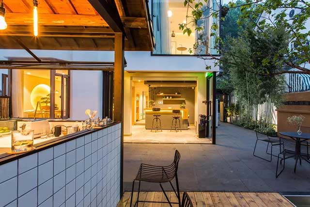 民宿酒店的庭院中設有獨立的木屋作為吧臺,吧臺的附近設有休閑區(qū),以供旅客在此娛樂休閑。