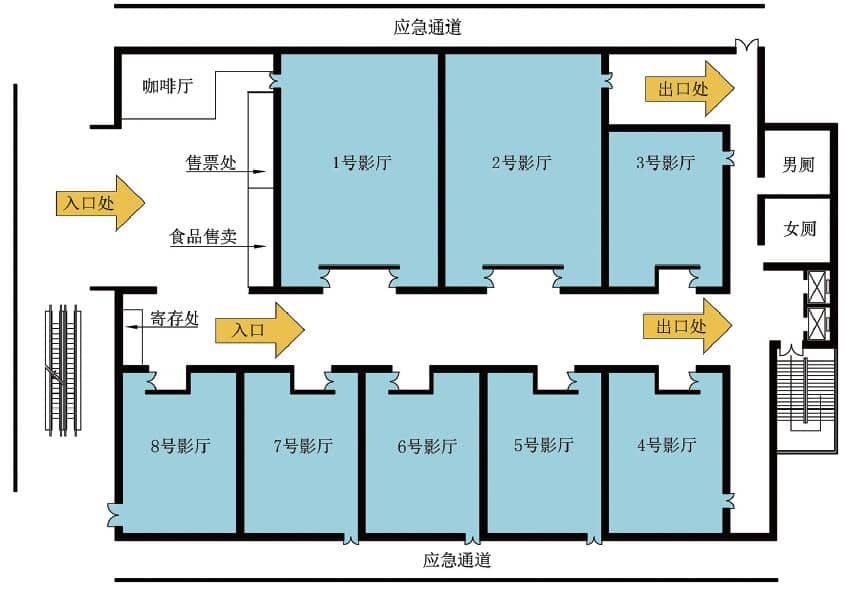 電影院的觀眾席位置應在一個正方形且規(guī)則的區(qū)域內(nèi),這樣可以有效提高建筑面積的利用率。對于一個商業(yè)面積很大的電影城來說,人員的疏散和緊急通道的設置會更加重要。