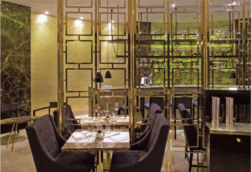 空間右側(cè)是餐廳的吧臺(tái)部分,弧形屏幕面板鑲嵌著黃金,閃閃發(fā)光。酒吧的正面是嵌在扇貝中的意大利褐紅色皇家珍珠,放置在彎曲的輪廓上,后面是一系列明亮的黃銅櫥柜。地板幾乎是反光的水銀石,而天花板被畫成三層弧形,微微發(fā)光。