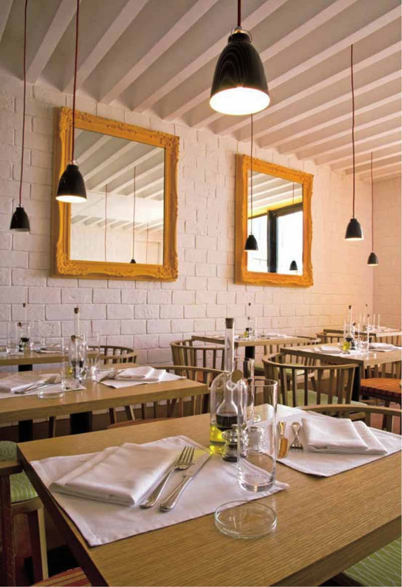 進(jìn)入這個(gè)餐飲空間,迎接客人的是一座閃亮的黃銅雕像,它水平坐落在一面橡木彎曲景觀墻前。左邊是咖啡廳,一個(gè)氛圍輕松,裝修簡(jiǎn)單的房子。四周是刷著白漆的磚墻,頂上是木梁,地板是天然的棕色瓷磚。走進(jìn)這里,就像置身于谷倉(cāng)或低調(diào)奢華的農(nóng)舍。咖啡店里有兩扇門,可以通往忙碌的廚房。高大的展示柜展示了廚師的美味佳肴,甚至是食譜,供客人享用。這個(gè)房間的后面有一個(gè)巨大的黃色入口,通過(guò)這里的玻璃門通向陽(yáng)臺(tái)。