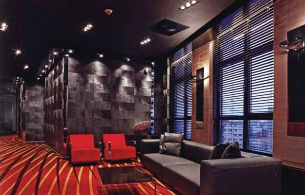 上面組圖顯示了某銀行總部的辦公室設(shè)計(jì)。因?yàn)槭强偛?,為了突?**、穩(wěn)重、大氣的感覺,又不失現(xiàn)代感,在材料的運(yùn)用上突出特色。黑、紅、黃質(zhì)感材質(zhì)和反光材質(zhì)的搭配,讓這種感覺恰到好處。