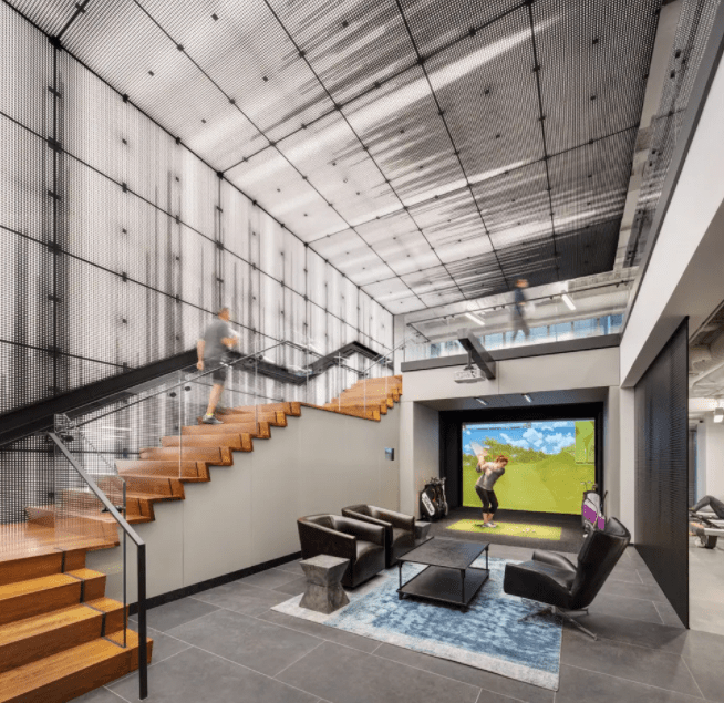 上圖是某公司員工休息區(qū)的設(shè)計方案。公司不會在休息區(qū)投入太多改造資金,也滿足了放松的環(huán)境需求。空間既不能顯得破舊,又要滿足休閑的需求。該方案不采用常規(guī)的空間處理方式,采用門隔斷的形式,使空間靈活而不死板。天花板和四面墻沒有過多的材料包裹,使用一些不銹鋼反光材料增加空間的現(xiàn)代感,很好的解決了上述問題。