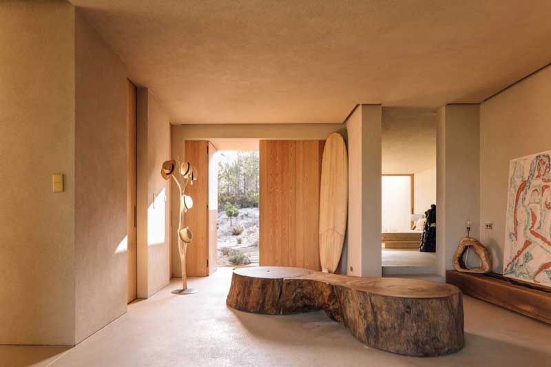 除了民宿外觀設計以外,民宿室內(nèi)空間也十分簡約,空間中并沒有采用太多的裝飾品,而是以樸素的材料和自然感極強的軟裝進行裝飾,給人一種優(yōu)雅的氣質。無論是民宿空間中樹枝樣式的掛衣架,還是實木的矮桌椅,枝椏形狀的燈具都給人一種淳樸之中而不失優(yōu)雅的柑橘,讓空間變得更加輕盈。