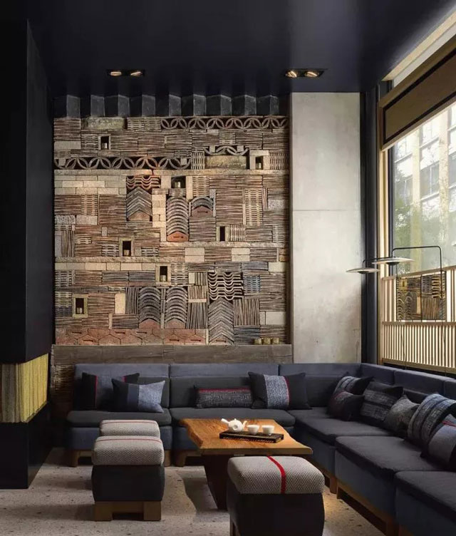 以古樸的灰磚瓦片作為客廳的背景墻,不僅可以用來協(xié)調(diào)深沉安靜的木質(zhì)座椅,更是讓人感覺自然和諧,純樸。
