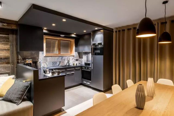 開放式廚房,櫥柜選用深沉的黑灰色,對(duì)比的色調(diào)讓空間更加有層次。