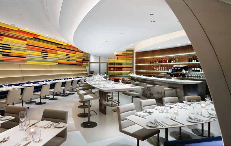 在建設(shè)過(guò)程中,設(shè)計(jì)師們將基礎(chǔ)建筑幾何轉(zhuǎn)換成了動(dòng)態(tài)的空間效果。其中,雕塑的應(yīng)用使天花板看起來(lái)無(wú)限延伸,波浪形的墻壁融合成舒適的座位,弧形的酒吧和公共長(zhǎng)桌給整個(gè)空間帶來(lái)生機(jī)。所有這些有趣的設(shè)置都給客人帶來(lái)樂(lè)趣。