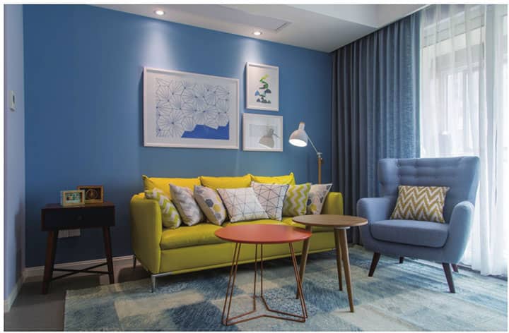 上圖中,客廳空間采用高純度的橙色作為沙發(fā)背景墻的主色調(diào),視覺效果強(qiáng)烈。與灰藍(lán)色的沙發(fā)形成強(qiáng)烈的對比。反差不僅形成于色相,也形成于色純度。強(qiáng)烈對比的配色方案給人一種時尚而充滿活力的印象。