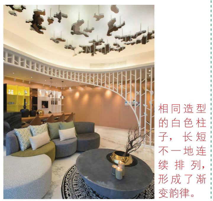 上圖展示的是漸變韻律在空間設計中的應用。漸變韻律在這個室內(nèi)空間中,形狀相同的白色柱子按照弧形連續(xù)排列,使空間具有強烈的節(jié)奏感,弧形同時具有動感效果。