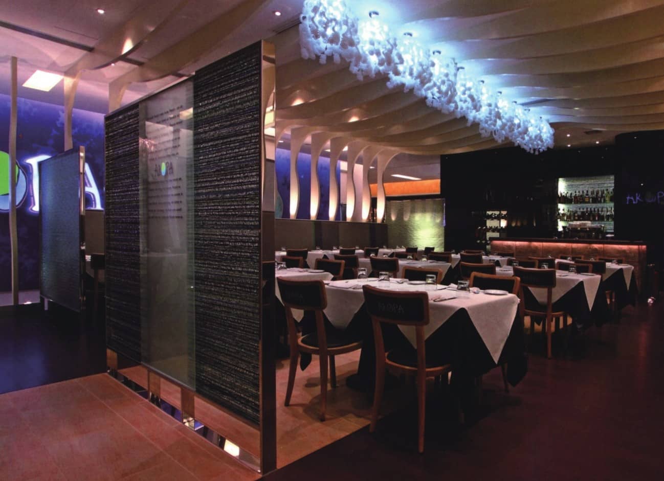 上圖所示,根據(jù)酒店的特點,酒店的餐廳從側(cè)面到天花板的設(shè)計使用了大量的曲線,營造出大海有節(jié)奏的潮起潮落。圍繞整個餐廳的開放式弧形結(jié)構(gòu)采用了開放式的方式,避免了與周圍環(huán)境的隔絕。水晶燈和云狀吊燈是空間的精華,突出了酒店空間設(shè)計的自然理念。